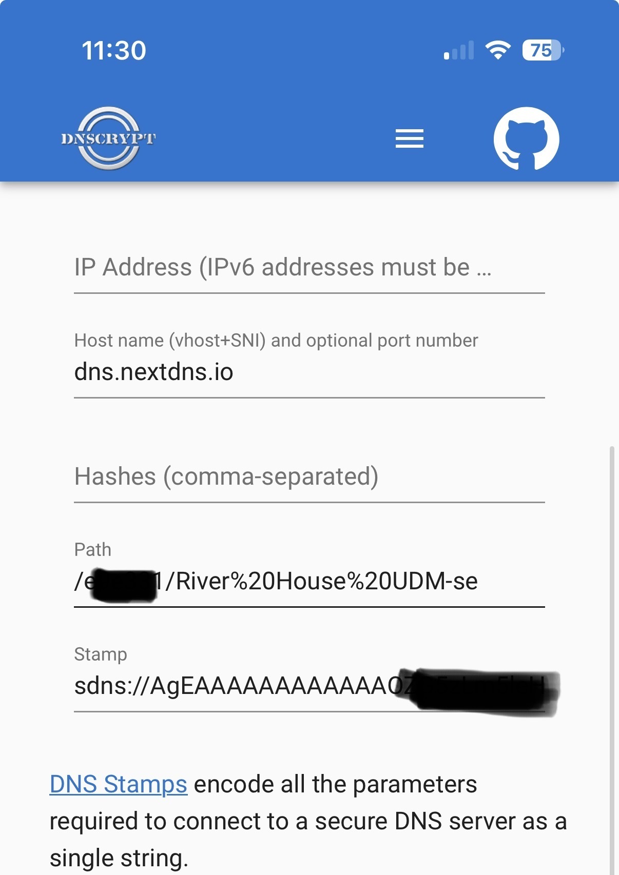 2. Enable the "Custom" option, give a name to the DNS and paste the stamp/SDNS you copied from NextDNS into the designated field. Your stamp can be found in the DNScrypt config.