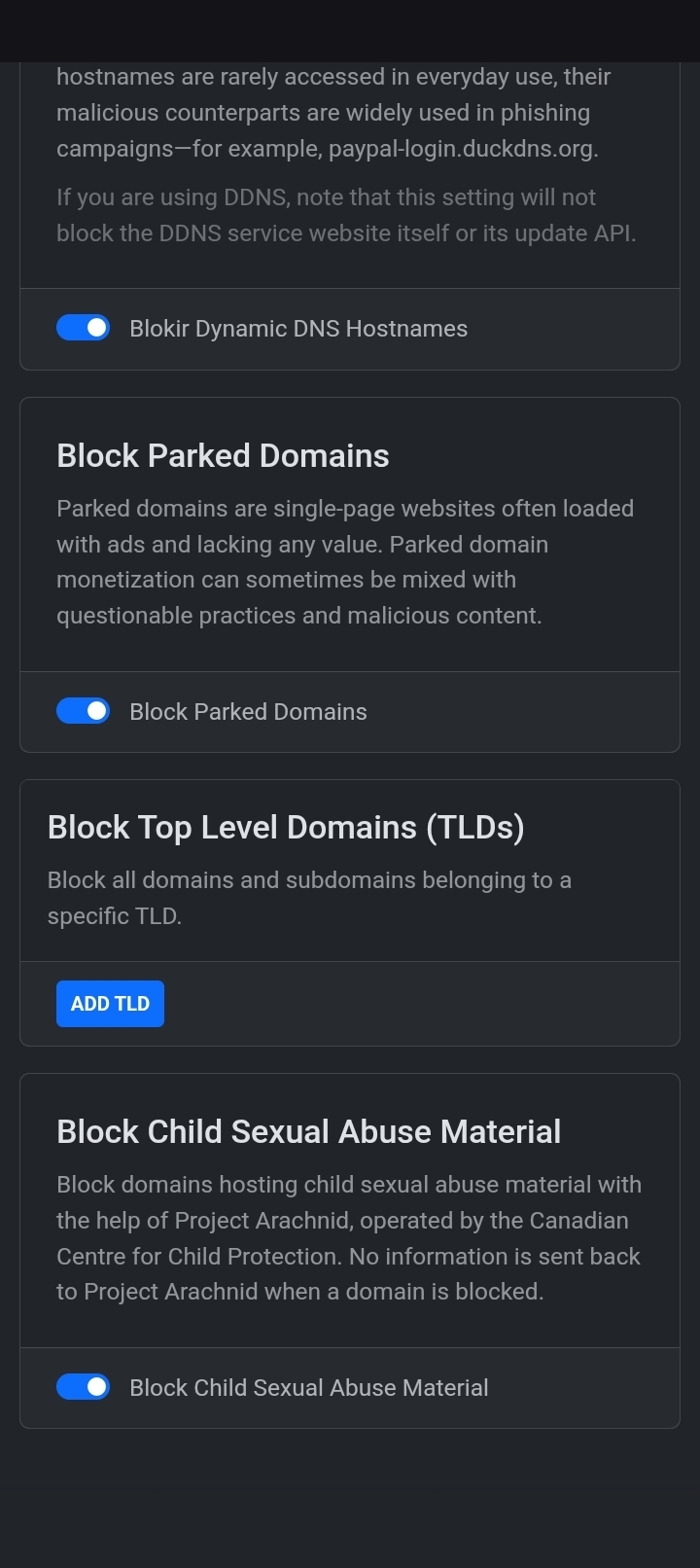 There's no way to block all domains, I use nextdns to block distractions. Would love if it could block all domains and i could just have an allow list. I can use Logs to allow domains that i dont see if it hindered any function. Also everything should have a down time feature, and the down time feature also could be expanded to allow for specific blocking of schedules. theres no way to create separate hours within a day of for the down time right now. Also sites and domains should have down time functions. Id like to be able to use certain sites at allowed times. Just some thoughts, But please add ability to block all domains.