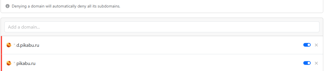 If possible, I would appreciate it if you could ensure that pikabu.ru and all its subdomains can be properly blocked via user Denylist without any overrides.