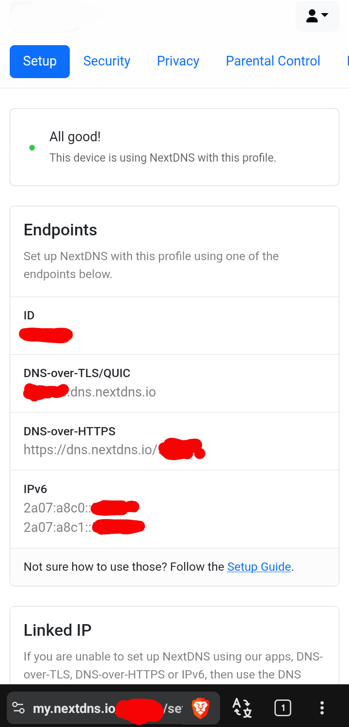-Profile ID (it is present where the red markings are in the photo) - If someone else has it, it can be used and will polute your logs and analytics or use your quota. If you exposed the ID https://my.nextdns.io - Settings - Duplicate - Start using the new one and delete the exposed one.