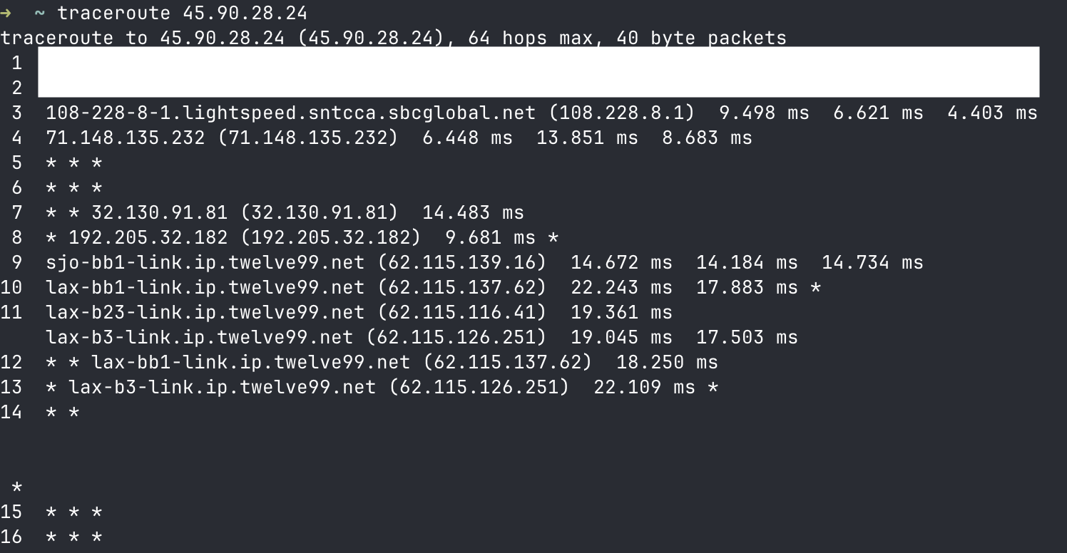 Hi - I'm currently unable to access 45.90.28.24 or 45.90.30.24 due to a routing issue at twelve99.net. I am on AT&T / AS7018. Traffic appears to drop at this 62.115.126.251 from, cannot ping or access udp/53. I've attached a ping traceroute and a layer four traceroute. Issues began around 3am-7am PST with last log from my network created October 16, 2025 at 7:37:16 AM