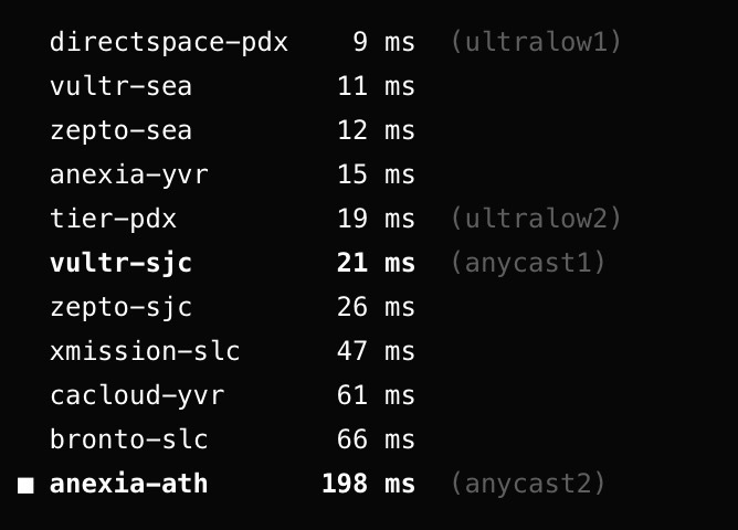 The second problem: Why is anycast2 defaulting to Athens in the first place? It should be vultr-sea as anycast1 and vultr-sjc as anycast2.