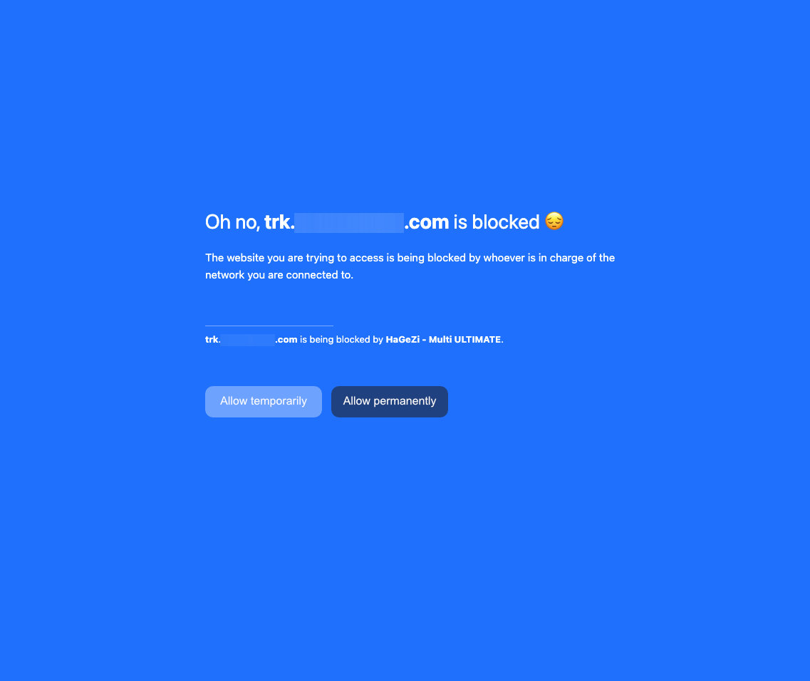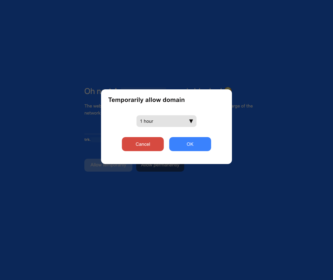 Please add buttons to allow a domain permanently or for 1, 12, or 24 hours temporarily to the block page that only appears for logged-in users with permissions to modify the domain list. This would help immensely with unblocking trackers for the purpose of unsubscribing from email newsletters. Currently, you must navigate to the control panel, add a domain, and, if temporary, remind yourself that you added it so that you can remove it later.