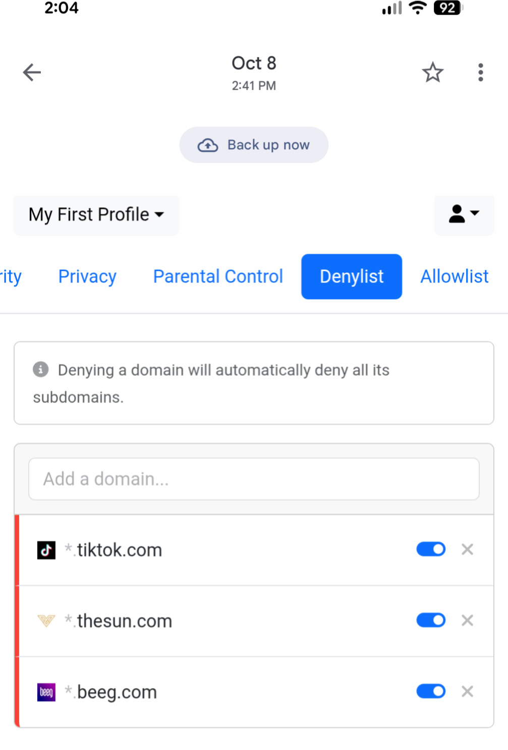 Despite multiple AI assisted attempts I have been unable to block this adult porn site despite being added to the deny list and being confirmed as blocked in the user logs. HELP!!!