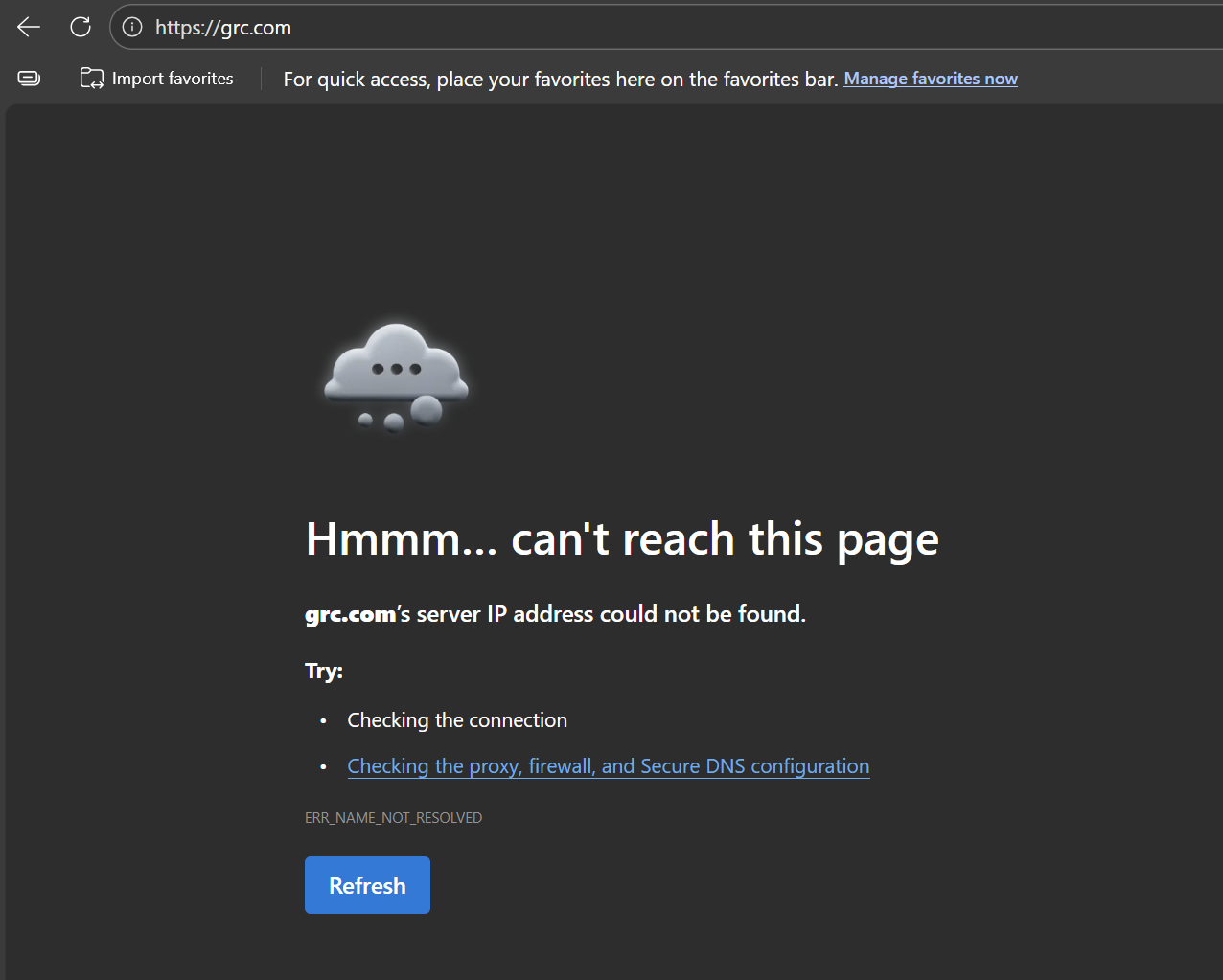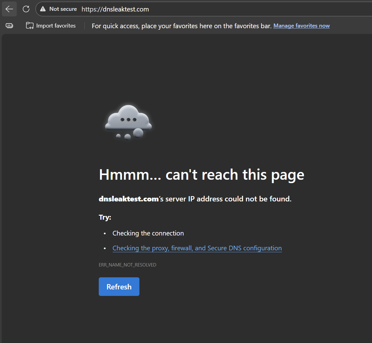 When accessing the domains grc.com and dnsleaktest.com, both result in an ERR_NAME_NOT_RESOLVED error (when using the Edge browser). Other browsers such as Chrome/Firefox also show an error indicating the page cannot be found.