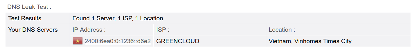 - If I check the DNS server from https://browserleaks.com/dns, it only recognizes the IPv6 address of the greencloud-sgn server.