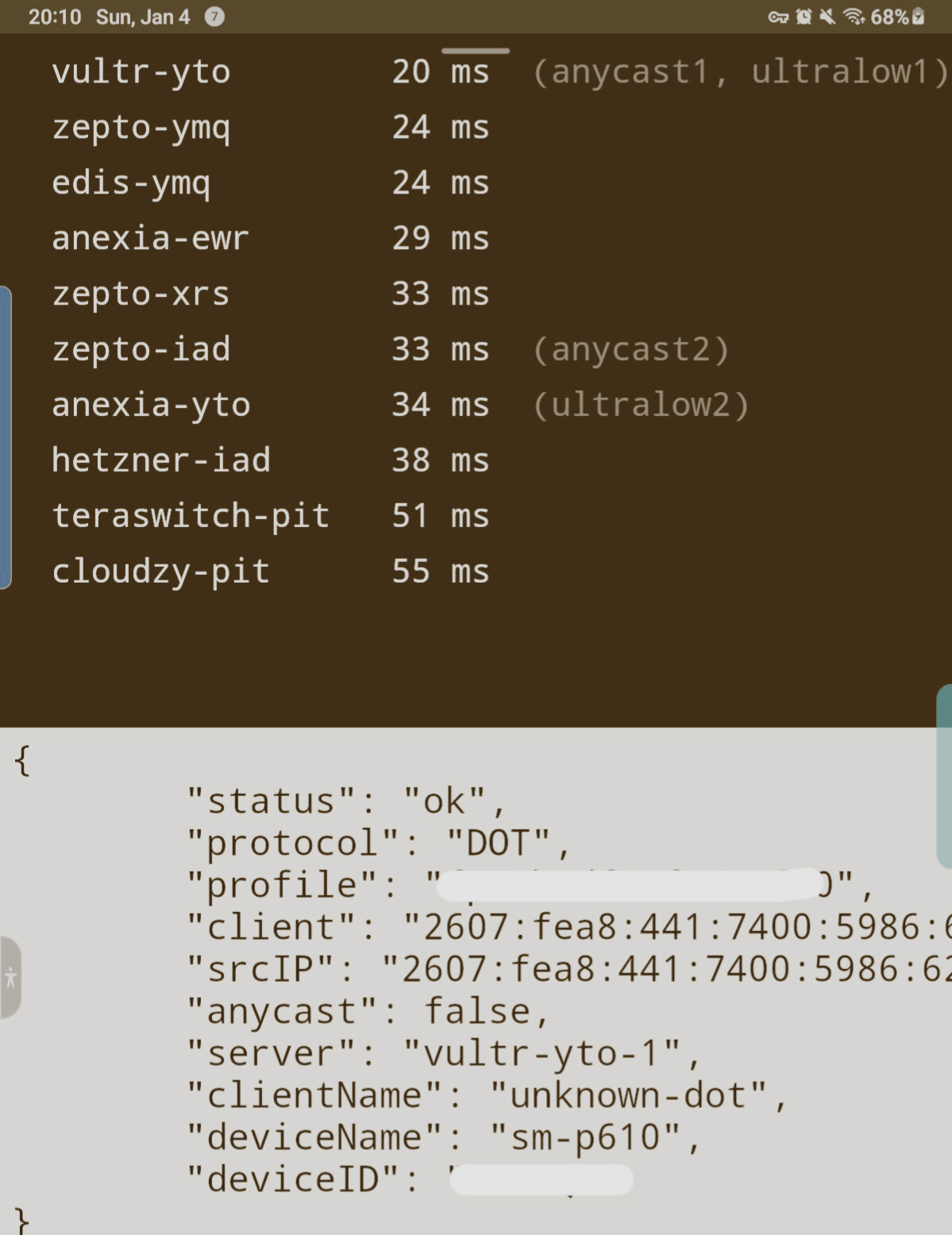 I have 3 different devices, each with their own NDNS profile & logs being saved to a different location. When I go to ping.nextdns.io website it doesn't always hit the lowest latency server, and eveything looks to be out of order sometimes. This is new behavior. What you see in the attached image, is exactly all I see. I test monthly. Have never seen results like this before.